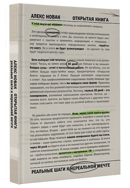 Описание «Открытая Книга» – совершенно уникальный проект по саморазвитию. Эта книга разительно отличается от всего, что издано ранее. К примеру, у нее нет первой стороны обложки (и поэтому ее нельзя закрыть) и ее нужно скорее не читать, а «проходить» (делать это нужно, кстати, ровно 60 дней – не быстрее и не медленнее). Есть связанная концепция, поделенная на блоки.